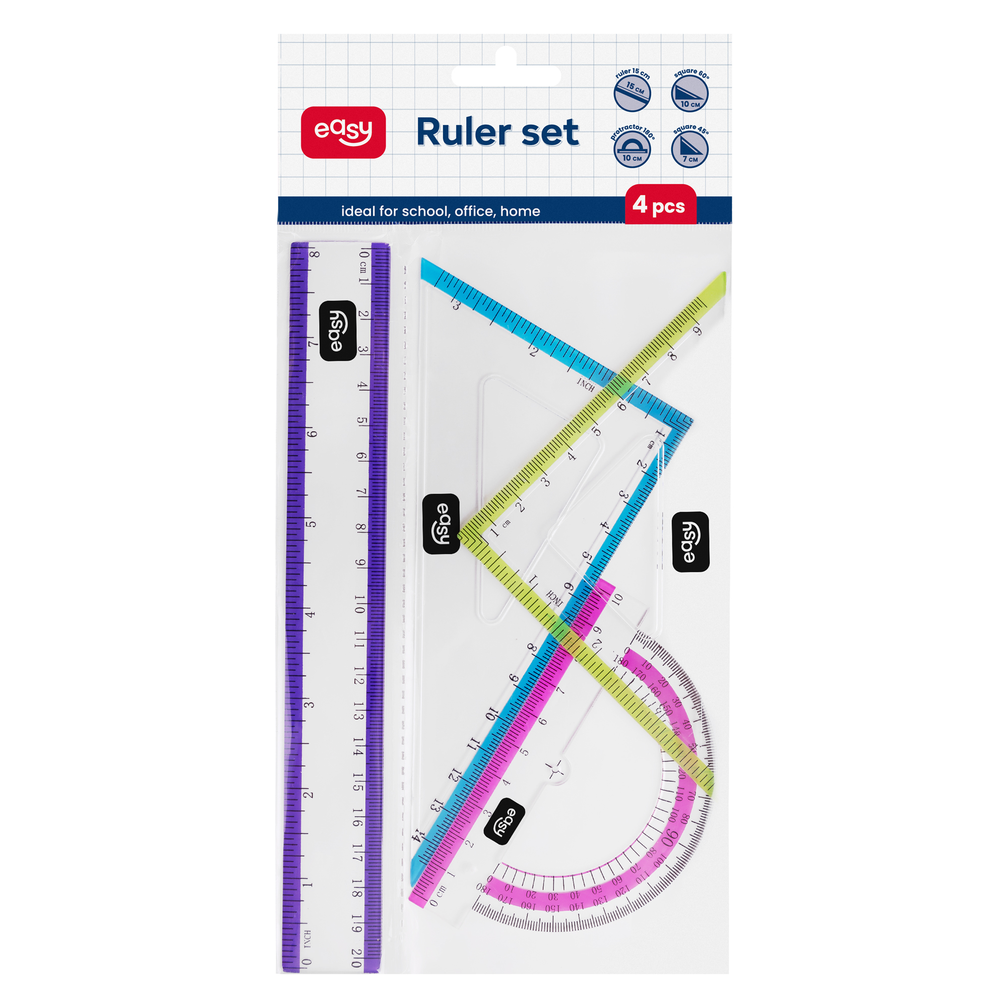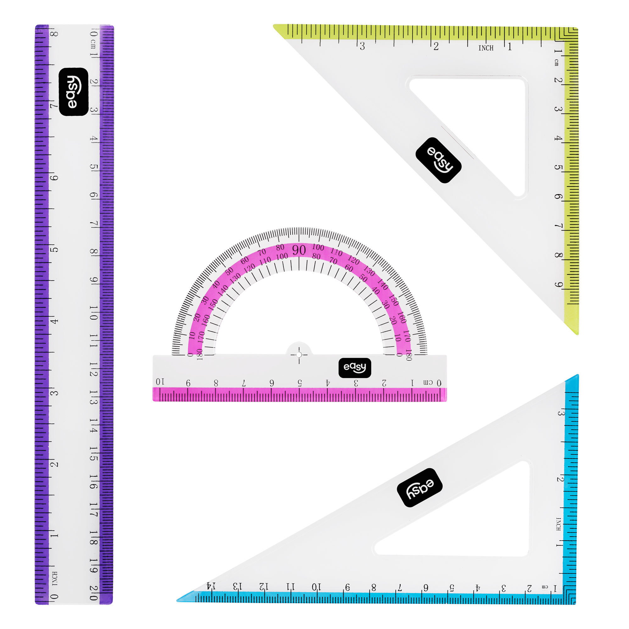 Hledáte praktickou a stylovou sadu pravítek pro geometrii? Sada EASY 4 v 1 obsahuje vše, co váš školák potřebuje pro rýsování a měření: pravítko (20 cm), úhloměr (180°) a dva trojúhelníky (45° a 60°).