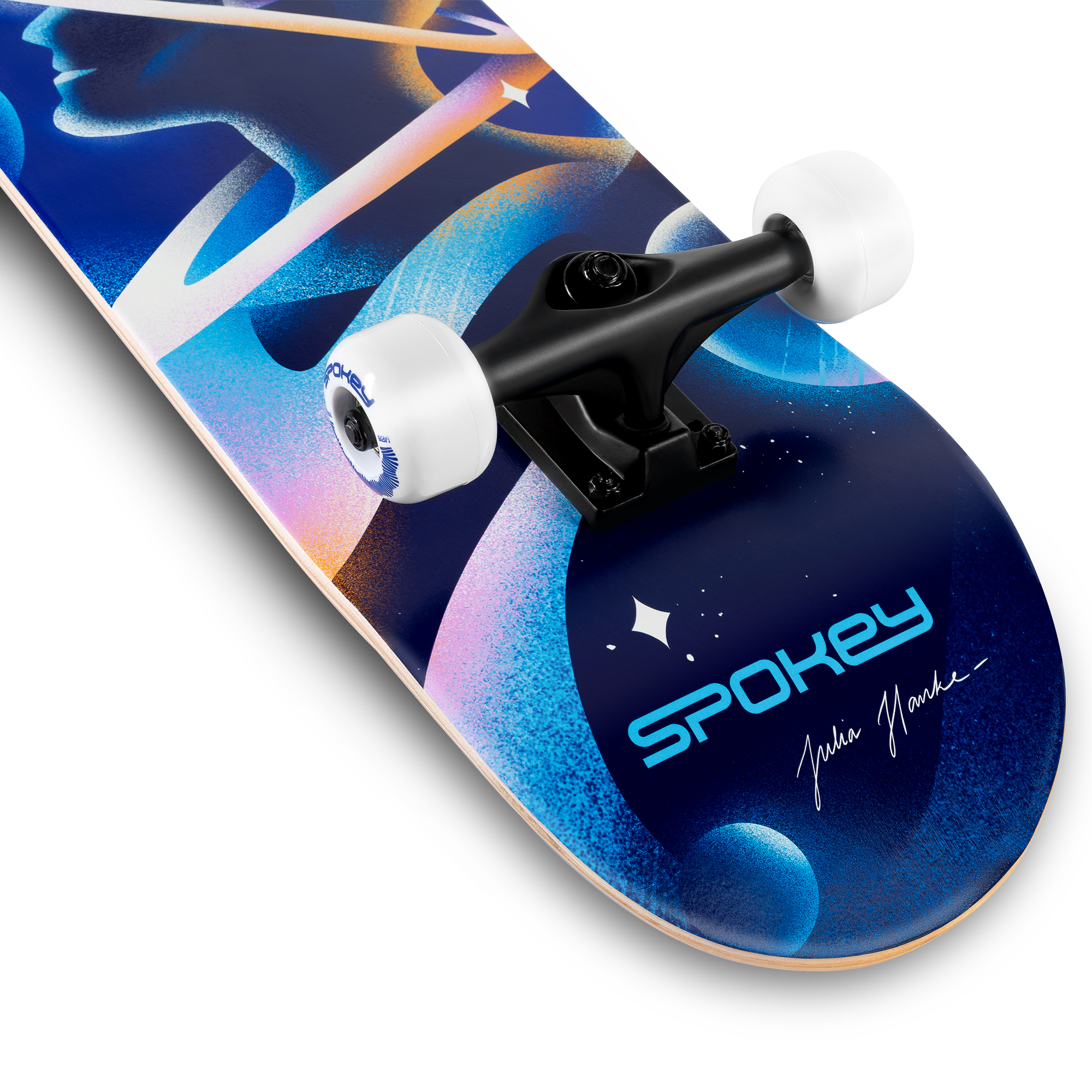 Skateboard Spokey ASTRO je ideální volbou pro ty, kteří chtějí spojit propracovaný design s komfortní a stabilní jízdou. Autorská grafika od ilustrátorky Julie Hanke dodává desce unikátní umělecký charakter. Díky klasické konstrukci z 9 vrstev čínského javoru se tento model skvěle hodí pro rekreační jízdu i pilování techniky na zpevněných površích.