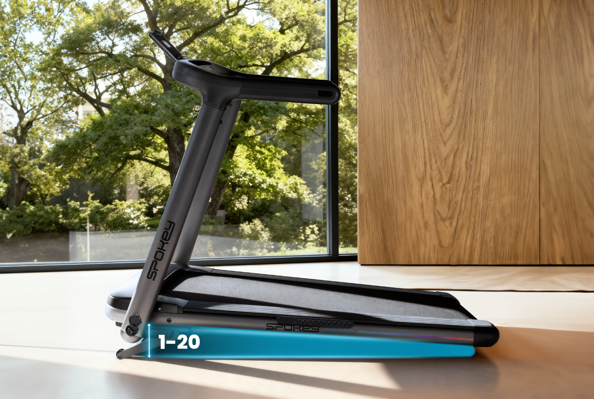 Běžecký pás Spokey SELENA - Kompaktní elektrický běžecký pás s Bluetooth a 20 úrovněmi sklonu