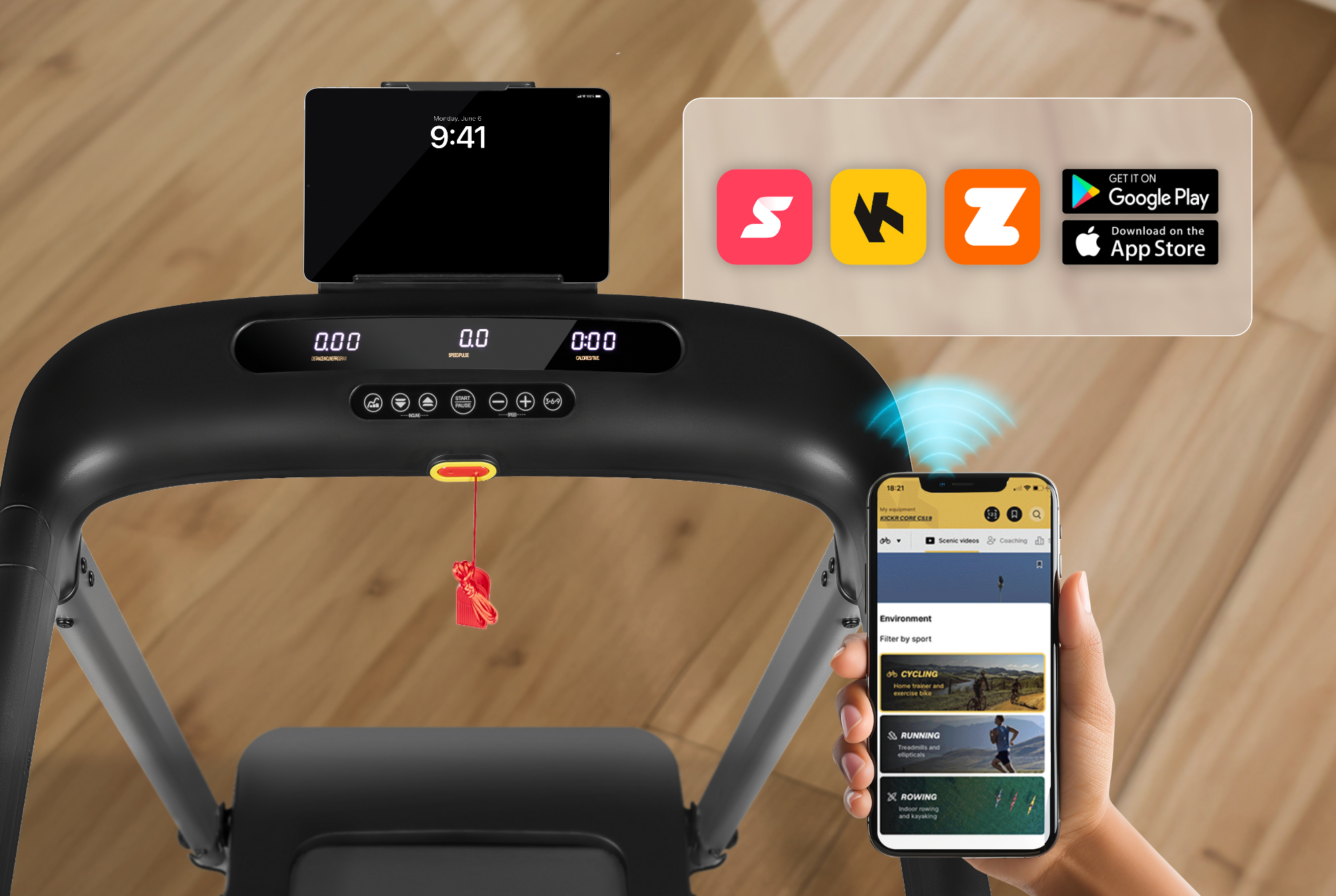 - Pro ještě lepší motivaci propojte pás s aplikacemi Kinomap, Zwift nebo Spax.